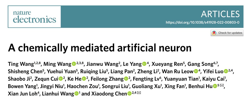 近日,bw必威西汉姆联官网、有机电子与信息显示国家重点实验室的王婷教授和汪联辉教授团队与新加坡南洋理工大学陈晓东教授、南京医科大学胡本慧教授开展合作研究,在柔性生物传感领域取得重要进展,开发了一种基于神经递质双向交互的人工神经元,构建了模态兼容的脑机交互界面。相关成果以A chemically mediated artificial neuron为题发表在国际顶级学术期刊Nature Electronics(《自然·电子学》)上。