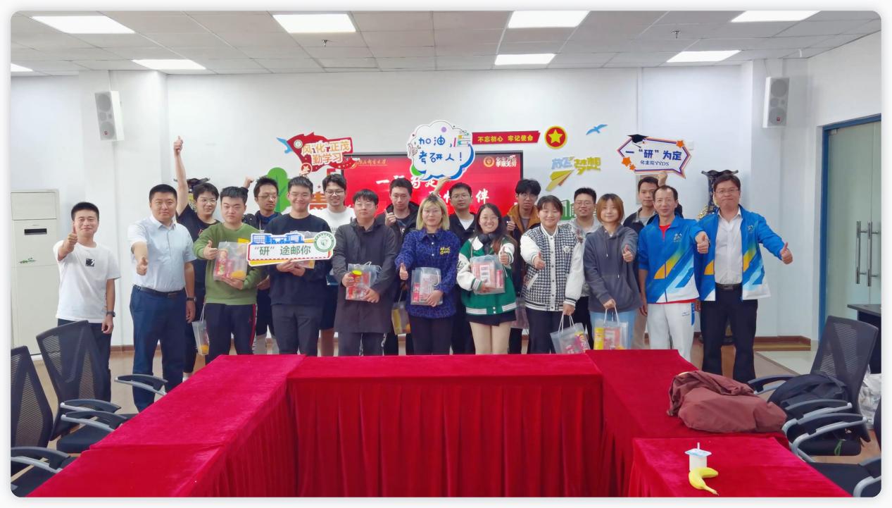 随后,公司领导为在场考研学子发放精心准备的慰问品,传递来自学院的真挚祝福。考研慰问品取意“事事顺意”,祝福化生院考研学子“考研顺利”:水果“橙”子——寓意马到“成”功;孔庙祈福文具——祈福员工考出好成绩,书写人生华章;乐事“薯”片——寓意一战成硕,必“属”于你。最后,公司老师与全体考研学子合影,齐声高呼:“化生万物,学致无穷。一往无前,终成所愿!”,记录下2024届考研学子的决心与勇气。