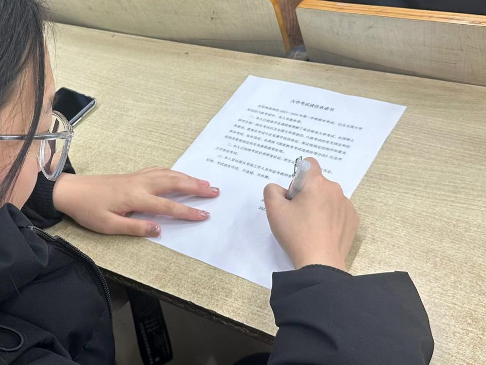 会议的最后,武颂凯老师带领2023、2021级全体同学们签署率诚信考试承诺书。诚信考试是员工的基本行为规范,是老员工应具有的道德素质。我们要正确认识到考试是检验学习成果的最好机会和重要手段,它能让同学们正确评价自己,找出学习上的失误和不足,在求学之路上不断进步。