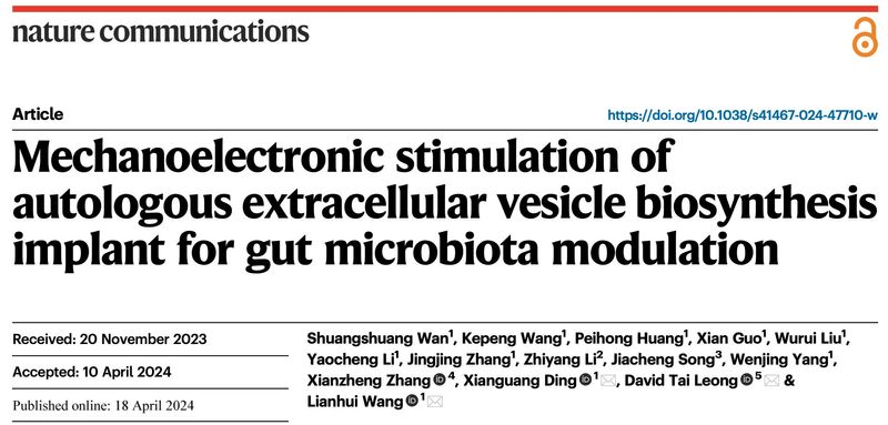 近日,bw必威西汉姆联官网汪联辉教授、丁显光教授与新加坡国立大学合作,在合成生物学与无线生物电子领域取得进展。相关成果以“Mechanoelectronic stimulation of autologous extracellular vesicle biosynthesis implant for gut microbiota modulation”为题发表在国际学术期刊Nature Communications上。重点实验室汪联辉教授、丁显光教授和NUS David Tai leong为共同通讯作者,青年教师万双双为论文第一作者,杨文静教授给予大力支持。
