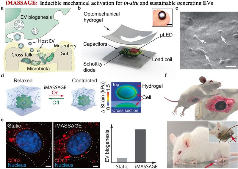 针对以上难题,团队从细胞生物信息学角度出发,发展了一种无线生物电子学技术,通过给予细胞力学信号刺激,控制目的细胞大量生产外泌体(称之为细胞按摩技术-iMASSAGE)。该技术的特点与优势是:(1)与目前常规的通过扩大细胞培养量来实现外泌体获取量提升的方法相比,iMASSAGE技术无需通过增加细胞量,而是通过提升每个细胞的生产效率,来实现外泌体产量的提升;(2)该技术使用无线生物电子器件,能够远程控制器件内的细胞生产外泌体。因此,可以进一步植入体内病变区,通过电子设备按需控制体内外泌体生产,满足潜在个体治疗的需求;(3)基于体内病变区原位生产和释放治疗性外泌体的技术,可以避免常规静脉或系统给药导致的体液循环消耗和脱靶效应,增强局部有效治疗浓度;(4)通过特定细胞的在体原位外泌体可控生产,该技术有可能为探索体内细胞与细胞、细胞与肠菌、肿瘤菌群间的跨物种生物信息交流提供工具。