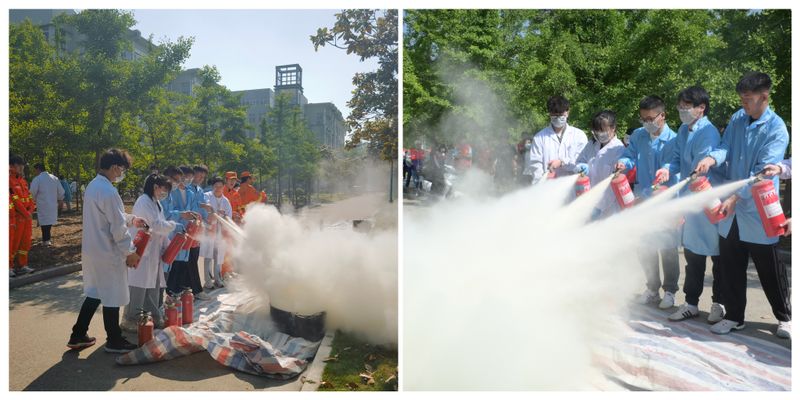 疏散演练结束后,两院开展了灭火器实操训练。消防员为师生们详细介绍了各种灭火器的类型及其特性,现场演示如何正确使用灭火器。师生们在消防员的指导下,分组进行实操灭火演练,现场气氛热烈。