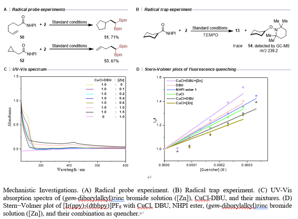 本研究报道了一种新型的光/铜协同催化脱羧偶联方法。该方法通过将易得的羧酸与二硼甲基锌试剂反应,实现了 C(sp3)-C(sp3) 交叉偶联,成功合成了富含 β-C(sp3) 和叔C(sp3) 的偕二硼砌块。该方法具有显著的普适性和广泛的适用范围,无论在药物分子的合成还是天然产物的后期修饰中均表现出优异的效果。特别是在富含C(sp3) 的药物候选分子合成中,本方法提供了一个高效且通用的合成平台。这一技术进展不仅提升了药物化学合成的效率,还有望加速新药的研发进程,为医药领域带来更多创新与突破。