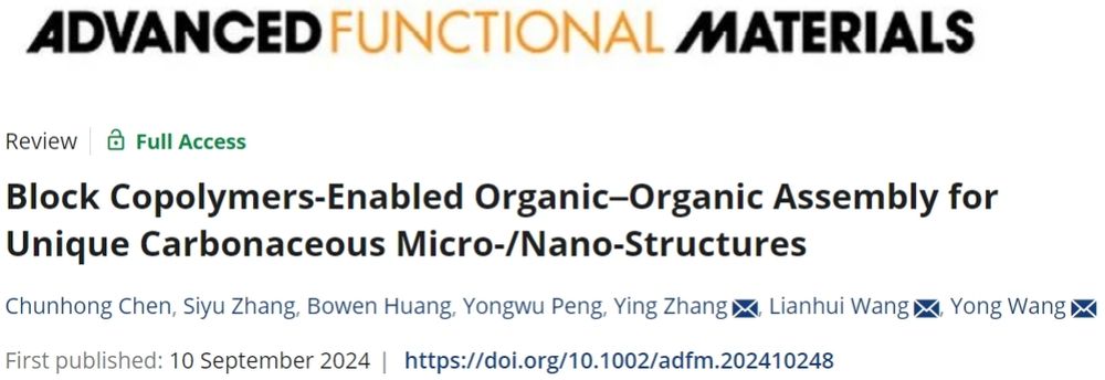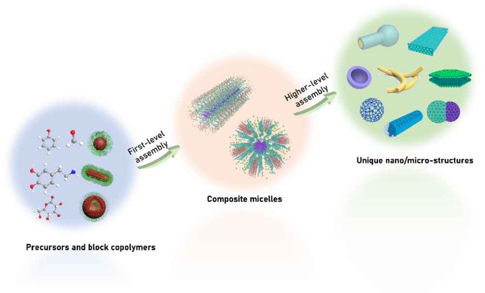 在这一背景下,bw必威西汉姆联官网bw必威西汉姆联官网汪联辉教授、陈春红教授和电子与光学工程公司、柔性电子(未来技术)学院张颖副教授联合浙江大学化学系王勇教授共同在Advanced Functional Materials期刊上发表了综述论文“Block Copolymers-Enabled Organic–Organic Assembly for Unique Carbonaceous Micro-/Nano-Structures”。论文全面总结了从常用有机前驱体(如苯酚/甲醛、多巴胺和生物质)衍生的独特微纳结构的合成机制和潜在应用,回顾了每种前驱体的聚合机制,并介绍了通过BCPs和有机前驱体分子形成复合胶束的制备策略,详细阐释了复合胶束如何组装成更高级结构。文章还探讨了这些材料在多相催化、电池技术、分离科学和智能药物输送等领域的应用潜力,以及合成具有独特微纳结构的炭材料面临的挑战与未来发展方向。