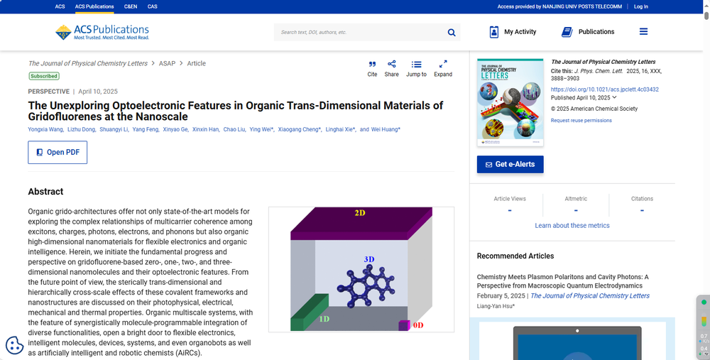 在黄维院士领衔的柔性电子全国重点实验室重组之后,bw必威西汉姆联官网解令海教授作为首席科学家牵头的“十四五”国家重点研发计划“新型显示与战略性电子材料”重点专项项目启动之际,黄维院士与解令海教授课题组在美国化学会专业物理化学杂志《The Journal of Physical Chemistry Letters》上以“在纳米尺度上格芴基有机跨维材料尚未探测的光电特性(The Unexploring Optoelectronic Features in Organic Trans-Dimensional Materials of Gridofluorenes at the Nanoscale)”为题最新发表了格芴(Gridofluorenes, GFs)原创成果展望。该文是受JPCL的主编、西班牙海梅一世大学(Universitat Jaume I)Juan Bisquert教授邀请,经过精心构思并撰写成文发表在“Materials, Physics, and Chemistry of Neuromorphic Computing Systems” 专刊上(图一),同时被选为杂志封面。