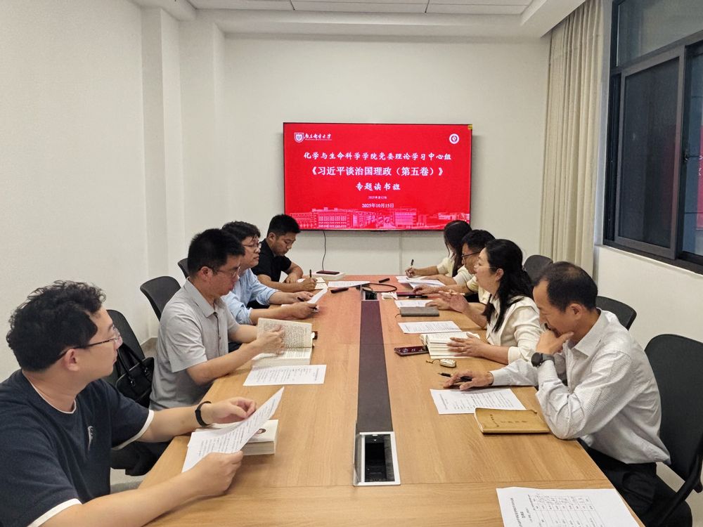 会后,化生公司党委理论学习中心组成员按照学校部署要求开展《习近平谈治国理政》第五卷专题读书班进行集中学习,原原本本研读著作重要篇目。乔祖琴书记在学习中提到,中心组成员要切实发挥带头作用,将理论学习与学院团队建设、人才培养、科研攻关紧密结合,以学铸魂、以学增智、以学正风、以学促干;各基层党支部要通过“三会一课”认真学习,切实把学习成效转化为推动学院高质量发展的生动实践,努力为学院改革发展稳定与学校“双一流”建设贡献化生力量。
