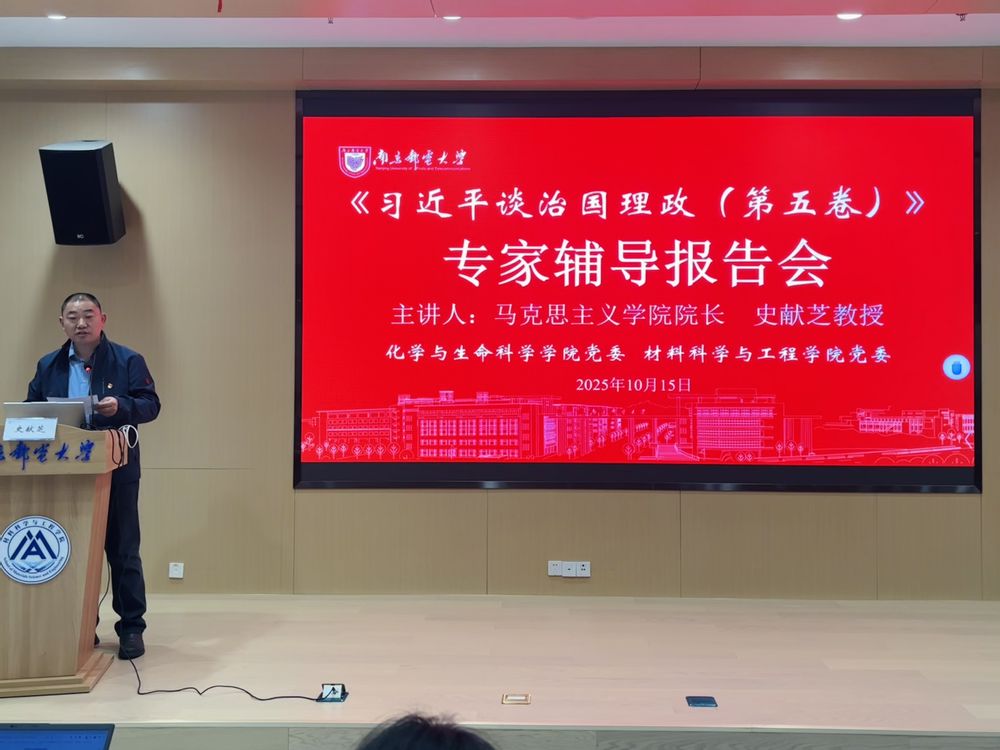 报告会上,史献芝教授以“学习《习近平谈治国理政》第五卷”为题,从“提高认识,深刻领会重大意义”“学懂弄通,准确把握核心要义”“学思践悟,确保学习走深走实”三个维度进行系统讲解,强调要将第五卷和第一卷至第四卷作为一个整体来学习,把握好学思践悟的深浅之道,要以追本溯源把书读深,以身体力行把书读浅,以融会贯通把书再读深。结合工科背景,史教授还深入阐释了著作对科研与教学的指导价值,点明其为中国式现代化推进、中华民族伟大复兴提供的方法论支撑。报告主题鲜明、内容丰富、事例生动,为参会人员深入学习《习近平谈治国理政》第五卷,深刻领悟习近平新时代中国特色社会主义思想的真理力量和实践伟力提供了有力指导。