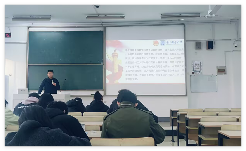 其次,窦浩铭围绕《中国共产主义青年团章程》《关于深入推进新时代新征程全面从严管团治团的意见》等文件展开讲解,深入剖析了从严治团的重要意义和具体要求。他指出,从严治团是共青团履行根本职责、巩固党执政的青年群众基础的必然要求。同时,他还结合学院实际情况,对团员们提出了明确要求,鼓励大家以高标准严格要求自己,争做合格团员。特别的,他重点解读了《中华人民共和国宪法》《中华人民共和国教育法》《宗教事务条例》《高等学校校园秩序管理若干规定》等法律法规,阐明从加入共青团的那一刻起,青年人就已经做出了信仰的选择,成为无神论者。因此,共青团员要坚决拥护中国共产党的纲领,不得信仰宗教和参加宗教活动。
