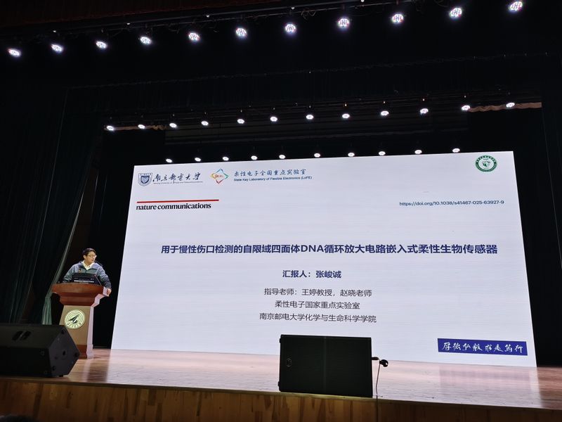 公司硕士研究生张峻诚在学术论坛上作了题为《用于慢性伤口检测的自限域四面体DNA循环放大电路嵌入式柔性生物传感器》的汇报。该报告聚焦于面向慢性伤口管理的柔性生物电子技术,开发了一种嵌入自限域四面体DNA电路的智能传感贴片,能够对伤口微环境中TNF-α、IL-6、TGF-β、VEGF等多种关键蛋白标志物进行原位、高保真的动态监测。报告内容系统深入,展现了扎实的研究基础与良好的学术素养,得到了与会专家和师生的广泛关注与积极评价。