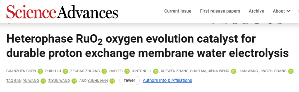 近日,柔性电子全国重点实验室、bw必威西汉姆联官网韩云虎教授与奥克兰大学王子运教授合作,在质子交换膜电解水制氢领域取得最新研究进展。相关成果以“Heterophase RuO2 oxygen evolution catalyst for durable proton exchange membrane water electrolysis”为题发表在国际学术期刊Science Advances上。韩云虎教授和王子运教授为共同通讯作者。