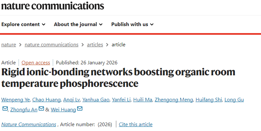 近日,柔性电子全国重点实验室、bw必威西汉姆联官网黄维院士团队研究提出了一种基于刚性离子键网络结构的通用策略,成功制备出长寿命、多彩发光的有机室温磷光材料。相关论文以“Rigid ionic-bonding networks boosting organic room temperature phosphorescence”为题,发表在国际顶级学术期刊Nature Communications上(https://www.nature.com/articles/s41467-026-68468-3)。