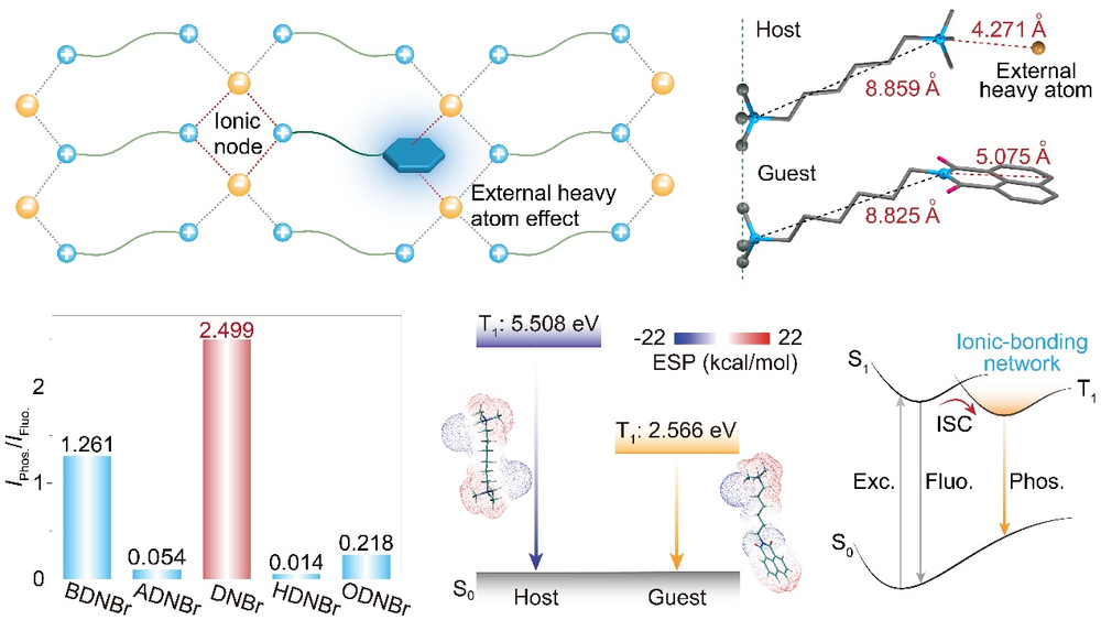 针对这一问题,黄维院士团队巧妙选用带有不同链长的季铵盐烷基链作为主体材料,以季铵基团功能化修饰的磷光发色团作为客体。该选择方式的关键创新在于主体烷基链天然具备高于客体发色团的单重态与三重态能级,从根源上杜绝了反向能量转移的问题,为高效磷光发射奠定基础。更值得关注的是,通过主客体分子间的强静电作用,构建了连续且稳定的离子键网络,形成了刚性极强的限域微环境,有效限制客体分子运动、抑制非辐射跃迁,为三重态激子的稳定提供了绝佳保障。与传统研究中依赖直接添加重原子的思路不同,该团队开创性地通过主客体烷基链的精准匹配,高效激发外部重原子效应,形成了独特的磷光增强机制。通过烷基链匹配与外部重原子效应协同作用,实现了从蓝色到橙红色的多色磷光发射,最长寿命达到572.27毫秒。该研究整合了主客体掺杂的便捷性与离子相互作用的稳定性优势,深刻揭示了离子键在构建有机室温磷光材料中的独特价值,有效解决了传统材料面临的兼容性差、制备复杂、性能受限等瓶颈,为离子型有机室温磷光材料的发展提供了核心理论支撑与技术参考。