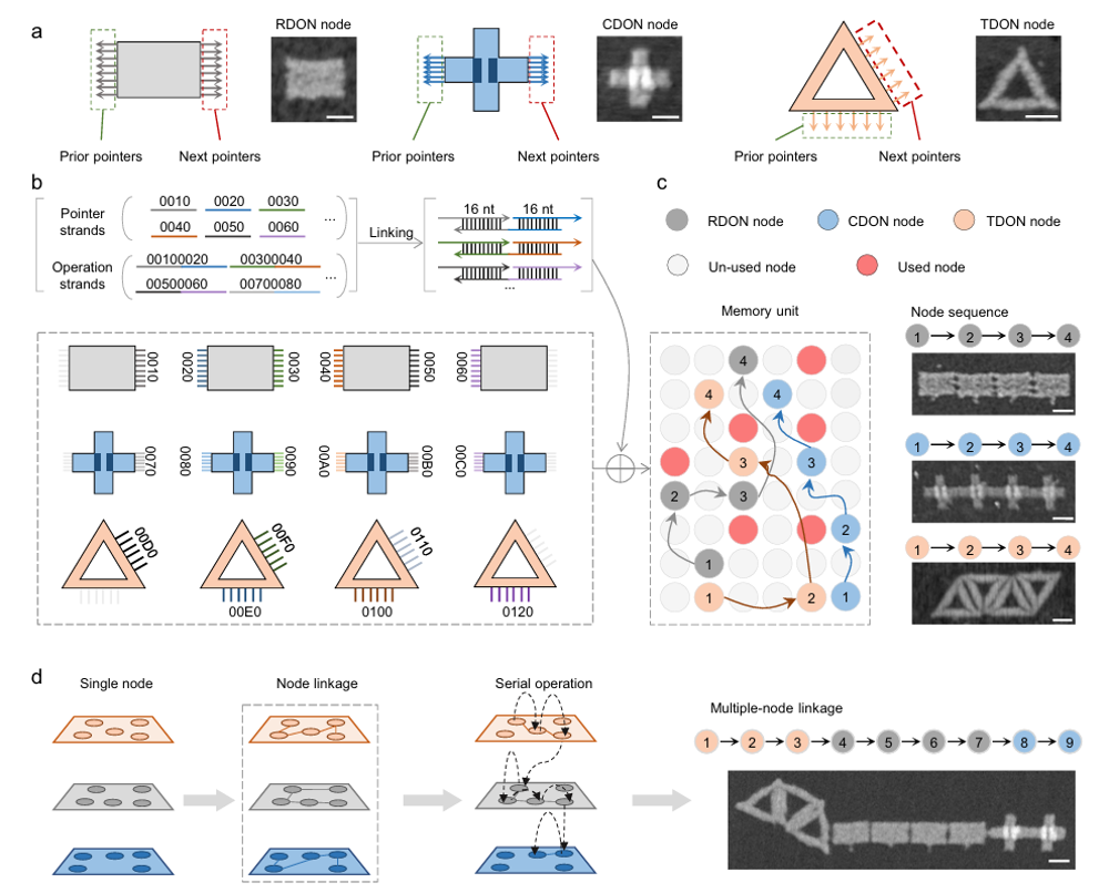 科研团队受计算机科学中链表概念的启发,设计并构建了三种形态各异的DNA折纸纳米结构作为信息存储的基本单元,分别为三角形(TDON)、矩形(RDON)和十字形(CDON)节点。每种结构均集成数据与指针两大功能模块:数据域借助链霉亲和素与生物素的特异性结合,将带有二进制编码的数据链精确锚定于节点上;指针域则通过预设的DNA单链序列,与可编程的“指令链”发生互补配对,从而实现节点之间的可控连接或断开。这一机制借鉴了计算机链式存储的思想,使得数据不必局限于连续空间,能够根据信息量动态扩展,在数据更新时也无需整体迁移。