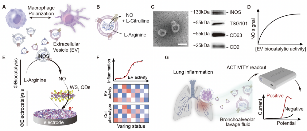 细胞外囊泡是由几乎所有类型细胞分泌的纳米级囊泡,富含蛋白质、核酸以及代谢物等多种分子信息,近年来已成为液体活检领域极具潜力的生物标志物。然而,目前对细胞外囊泡的研究多集中于核酸与蛋白质等成分的分子表征,对其内在代谢活性及其在生理与病理过程中的功能意义仍鲜有探索。在炎症反应中,巨噬细胞发挥关键作用,其极化状态与酶的代谢活性密切相关,针对内脏器官炎症中细胞样本获取困难的问题,开发基于细胞外囊泡的代谢活性检测方法,有望为炎症性疾病的无创诊断提供新思路。